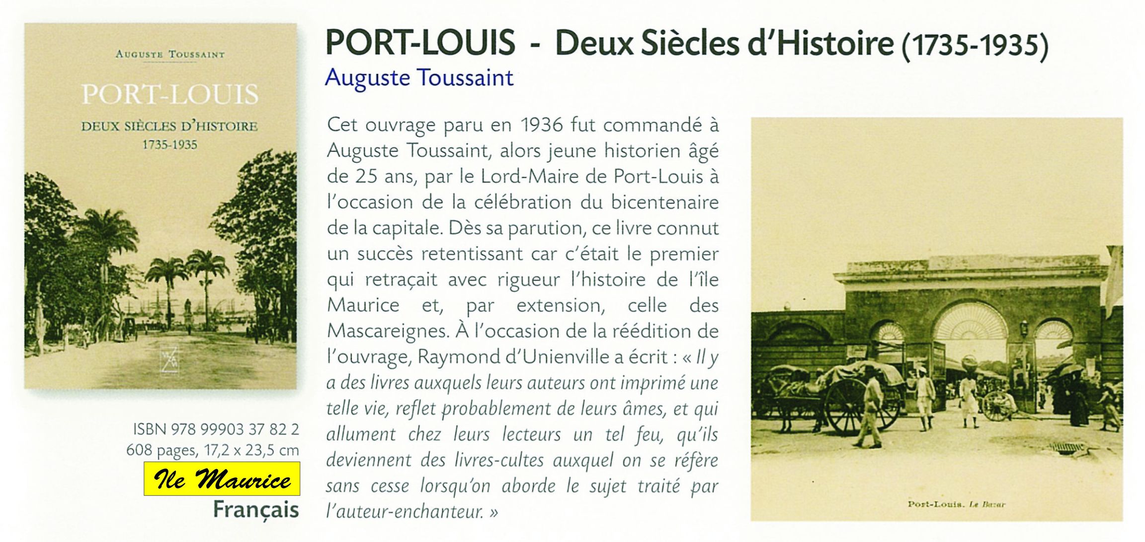 La première édition de cet ouvrage date de 1936. Dès sa parution, ce livre connut un succès retentissant car c’était le premier ouvrage qui retraçait la vie de l’île Maurice et, par extension, celle des Mascareignes, pendant les deux cents années qui ont vu naître et grandir la cité de Port-Louis. Récompensé par La Société des Gens de Lettres de France et l’Académie des Sciences Morales et Politiques de Paris pour la qualité du travail de l’auteur et le sérieux de sa méthode, ce livre demeure jusqu’à ce jour un ouvrage de référence majeur pour tous les historiens et les universitaires tant Mauriciens qu’étrangers.