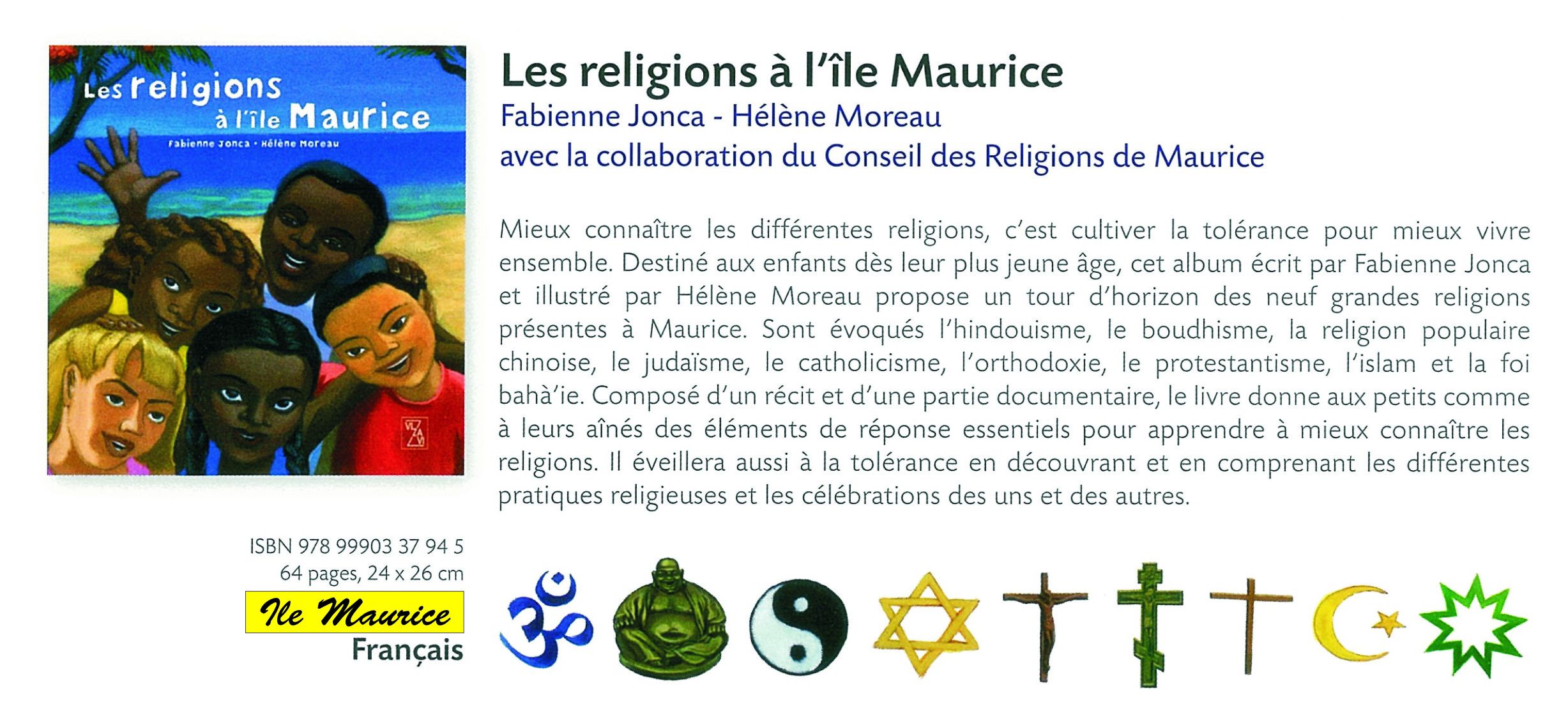 Destiné aux enfants dès leur jeune âge, cet ouvrage écrit par Fabienne Jonca et illustré par Helène Moreau, propose un tour d’horizon des neuf grandes religions présentes à Maurice : l’hindouisme, le bouddhisme, la religion populaire chinoise, le judaïsme, le catholicisme, l’orthodoxie, le protestantisme, l’islam et la foi Bahá’íe.