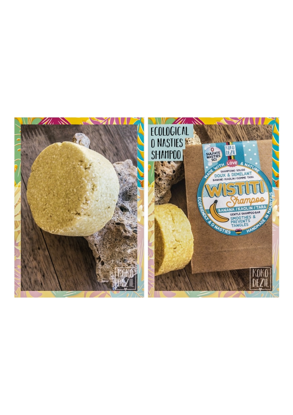 "Wistiti", délicieusement parfumé à la Banane naturelle, lave en douceur et rend les cheveux lisses, faciles à démêler. Il convient à tous, petits et grands ! Composition : SCG, Eau filtrée, Huile de Coco*, Bicarbonate de Sodium, Argile blanche, Riz, Banane*, Arôme naturel alimentaire de Banane, Gomme Tara, Curcuma* Poids : 90g / Taille : 3x6cm pH 7 adapté aux cheveux des enfants